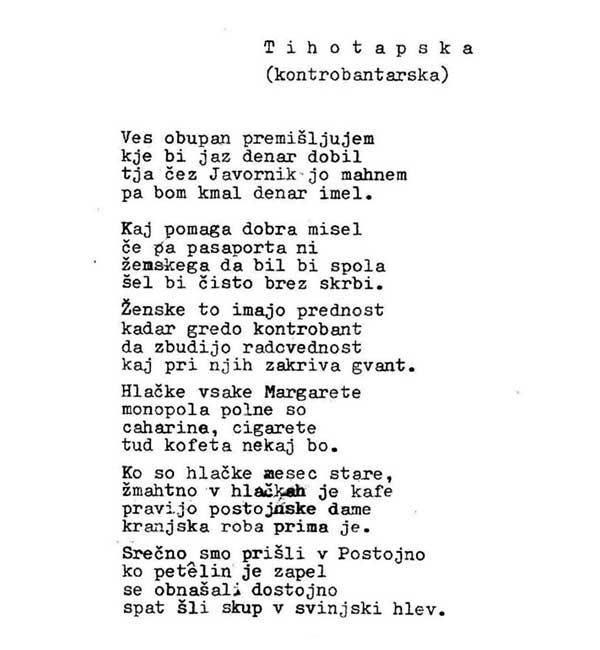 V zapuščini svojega pokojnega očeta, Miroslava Fajdiga (1929-2013) iz Pudoba pri Starem trgu, sem našel nepodpisani tipkopis pesmi Tihotapska (kontrobantarska).