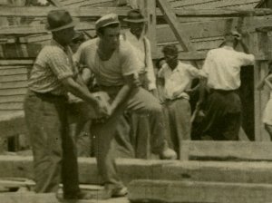 Prvi od leve je Franc Bavec starejši, Gregorinov ata, predsednik Obdelovalne zadruge Ulaka. Poleg njega je Anton Kočevar, Matjonov iz Podloža, zadaj je Urhov oče, Janez Škrbec. Z rokami v bok pa stoji Ignac Štirn, tesarski mojster. (Pri njem se je za tesarja izučil tudi moj oče, še pred vojno. Nedavno sem našla dokument, v katerem Štirn potrjuje, da je Jakob Mulec od – do – delal pri njem in dodaja, da je bil z njim “jako zadovoljen”…). S hrbtom proti gledalcu je obrnjen Jakob Kotnik, Andretov ata.Viri: