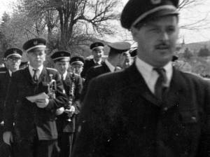 Fotografija prikazuje cerkniške godbenike, ki korakajo na prireditev ob odkritju spomenika. Godbeniki so na poti od nove kapelice proti Podskrajniku.