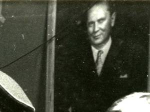 Fotografija, ki jo je posnel Jože Žnidaršič st., prikazuje gasilske funkcionarje na balkonu kulturnega doma v Cerknici.
