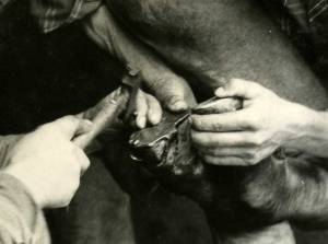 Neznani fotograf je v objektiv ujel trenutek, ko kovač Jože pribija žebelj v parkelj desne noge Kunčovega vola.