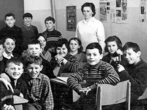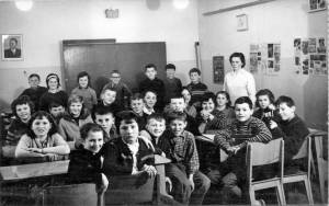 Slika 5. b razreda je dobesedno slika iz šolskih klopi. Ob svoji razredničarki Lojzki Vidrih so se učenci stisnili v en del razreda pred tablo. Zadaj na steni vidimo, nam starejšim zelo dobro poznano sliko, predsednika države Jugoslavije, tovariša Tita. Razredničarka je bila Cerkničanka in je kasneje tudi poučevala v Cerknici, poročena Žnidaršič. In sedaj sem prepričana, da bo enemu sodelavcu Starih slik zaigralo srce.