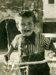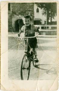 Kljub temu da je bil to čas druge svetovne vojne, je vesel in nasmejan, saj zna voziti kolo že pri dobrih štirih letih starosti. Seveda sedeža ni dosegel, zato stoji na pedalih.