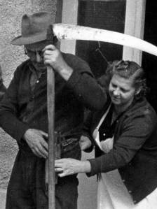 Janez Dragolič, ki se je s koso in grabljami vračal z njive, se je ustavil še v gostilni na Peščenku, kjer je srečal Franceta Obrezo. Pred fotografa se je postavil s koso v rokah, grablje pa je dal v roke Francetu.