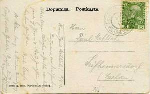 Razglednica, ki jo je izdal in založil A. Bole, je bila napisana 24. 6. 1913, tudi na žigu se vidi številka 24. Razglednica je odpotovala na Saško v mesto Seifhennersdorf, gospodu Paulu Mehlichu.