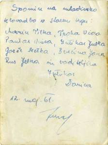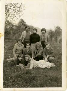 Na fotografiji smo članice večerne telovadbe ob zaključku. Kaže, da smo igrale med dvema, ker imamo žogo. Kot vidite, ni bilo nobene športne opreme, tudi supergov ne. Obleka je bila večkrat umazana od blatnih žog. Zaradi tekanja po pesku in blatu pa so razpadli tudi marsikateri čevlji.