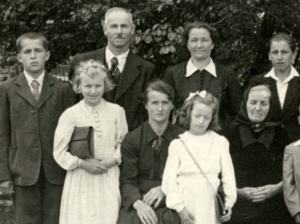 Nežno mamo (o njej smo že pisali v Starih slikah) obkrožajo edina vnukinja Jožica, pet vnukov, hčerka, tri snahe in ostali sorodniki. Manjkajo sinovi – očetje birmancev, ker so žal vsi padli med vojno. Mama Marija, moja stara mama, je imela pri birmi vse tri svoje otroke, pa še birmanska botra je bila svoji nečakinji Slavki. Po pripovedovanju moje mami Jožice vem, da je imela na obeh očesih gnojne izpuščaje, ječmene so to takrat imenovali. Zelo jo je bolelo, zato ni bila ravno najbolj razpoložena, kar se tudi opazi. Franci, najmlajši takratni udeleženec pa se spominja še enega dogodka. Dan pred birmo sta šla s sestrično Jožico v sosednjo vas k neki gospodinji po nageljne, ki jih je imela na vrtu. Na dan birme so jih dobili vsi birmanci in si jih pripeli na obleko. Jožica pa je dobila celo dva v lase. Če dobro pogledamo sliko, pa lahko ugotovimo, da tudi Feliks nekam mrko gleda. Bil je edini birmanec brez nageljna na obleki. Pa ne, da ga ni dobil. Le pred cerkvijo ni zdržal pri miru. Je bilo treba narediti en krog okrog cerkve, pa ga je izgubil.