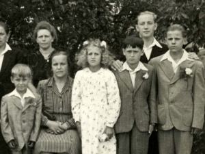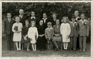 Razširjena družina Nežne mame, njenih birmancev z botri ter nekaj sorodnikov. Slikano na dan podelitve svete birme 18.6.1948 na župnijskem vrtu pri Svetem Vidu.