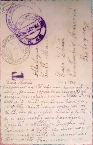 Na razglednici je žig vojne pošte št. 46 z nečitljivim datumom. Na drugem žigu lahko razberem le ZAPPATORI E MINATORI, tretji žig pa je sprejemni žig pošte Pontecchio Marconi.