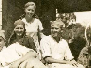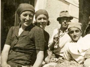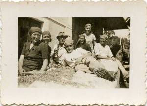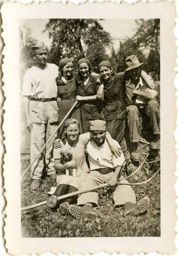Na spodnji sliki Jože drži senene vile, Julka grablje, Pepca pa majhnega psička. Na obeh slikah manjka Viktor Žnidaršič (Aničin oče), ker je bil takrat na delu daleč od doma.