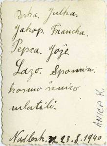 Zadnja stran slike je nema priča tistega časa. Dobro si je zapisati, da spomin ne zbledi. Zapisala je Aničina teta Rezka.
