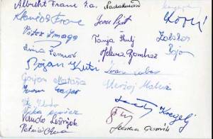 Zadnja stran s podpisi. Čeprav se niso vsi podpisali, se tako lažje prepozna sošolce tudi po več desetletjih. Svoj avtogram pa je dalo tudi nekaj učiteljev.Viri: