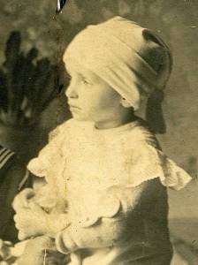 Jelka ima tu dve leti, v svetli oblekici so jo posadili kar na mizo. Na ljubki glavici ima zavezano rutko. Zdi se nekoliko zamišljena, kakor da je vlakec ne zanima kaj dosti. Zazrla se je nekam naprej, kakor da je nekaj drugega pritegnilo njeno pozornost.