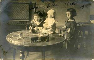 Od kod je bila poslana fotografija in kdo jo je poslal, lahko samo domnevam, saj nisem mogel razbrati rokopisa v nemščini. Morda je bila poslana z Gradca (Graz), ker sem edino to besedo zanesljivo razbral iz rokopisnega sporočila. Pri tem sem se spraševal, če niso morda doma posneto fotografijo uporabili kot dopisnico, lahko pa so bili otroci tudi pri kom na obisku in so jih tam fotografirali med igro z železnico. Na sliki so Aleks, Jelka in Maksi, kakor je zapisano nad njihovimi glavicami. O njih praktično ne vem ničesar, ker se z Urošem nismo nikoli pogovarjali o tem. Na sliki je videti na levi v ozadju otroško posteljo, zelo zanimiv pa je vlakec na tirih z železniško čuvajnico in ročičnim signalom na okrogli mizi v ospredju. Lokomotiva in trije vagoni so kar natančno izdelani. Že proti koncu devetnajstega stoletja so začeli izdelovati take vlakce iz pločevine. Desno od čuvajnice leži ključek, s katerim so navijali lokomotivo z mehanizmom. Kakšno veselje so morali imeti s tem vlakcem Domiceljevi otroci, še posebno dečka. Mi smo dobrih trideset let kasneje v našem otroštvu lahko le sanjali o čem takem.