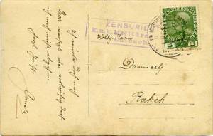 Dopisnica je bila naslovljena na blagorodno gospo Domicelj (Wohlgeborene Frau). Pečat na znamki je slabo čitljiv, dobro pa je viden pravokotni pečat cenzure – c. kr. vojaške cenzure (k. u. k. Militärzensur), ki je med prvo svetovno vojno vestno cenzurirala tudi to pošiljko.Slovarček: