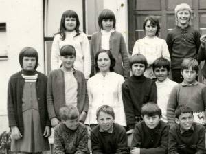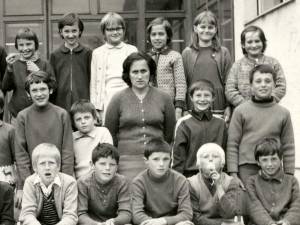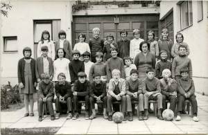 Klasična slika 4. b razreda v šolskem letu 1972/73 pred osnovno šolo. Med njimi je njihova razredničarka Milka Manfreda.