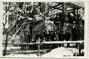Slivice 1. 12. 1965. Zima, mraz, sneg. Stavili cimper. Praktično vsi vaščani, verjetno niso vsi na fotografiji, so nam ob nesreči nesebično priskočili na pomoč. To je bila res prava solidarnost.Slovarček: