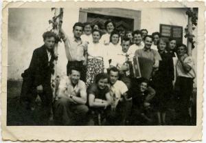 Slika je nastala ob poroki neveste Lojzke Balant v Osredku leta 1953. Pred njeno domačo hišo, pred katero so postavljeni okrašeni mlaji, so se slikali povabljenci. In to kar brez neveste in ženina.