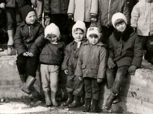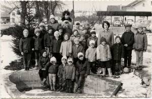 Dve vzgojiteljici in skupinica otrok se je v hladnem, zimskem dnevu oglasila pri fotografu Jožetu Žnidaršiču. Slikani so na dvorišču okrog znanega Bajčkovega bazenčka, v katerem smo v toplih dneh otroci hodili občudovat zlate ribice. Nekateri otroci so tokrat kar nadomestili manjkajoče zlate ribice, saj je bil bazenček izpraznjen in pripravljen na zimski čas. V okolici je lepo videti sneg, pa tudi otroci so toplo oblečeni. Lepa zimska idila!