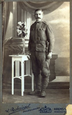 Kaj piše na zadnji strani te fotografije ne vem, ker je nisem mogel odlepiti iz družinskega albuma. Atelje z imenom Reckziegel še obstaja v Kremsu nad Donavo. Tudi ded se je vrnil iz vojne, vendar poškodovan, ker je med obstreljevanjem zdrsnil s poledenele lestve v globino.
