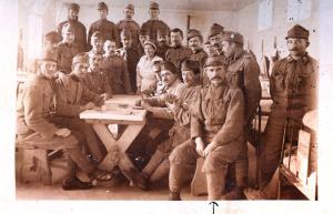Na drugem koncu mize se nasmiha medicinska sestra – vsaj danes bi ji rekli tako – v polkrogu za njo pa se je postavilo 13 vojakov. Čisto zadaj vidimo še štiri, ki najbrž stojijo na leseni klopi. Smo v četrtem letu I. svetovne vojne, leta 1917, v vojaški bolnici v avstrijskem Kremsu.