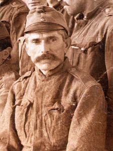 Na koncu desne klopi zamišljeno sedi vojak, ki ga je nekdo na robu fotografije označil s puščico. To je Janez Štefančič, moj ded.