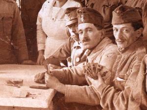 Za čokato leseno mizo sedi sedem avstro-ogrskih vojakov, štirje držijo v rokah igralne karte.