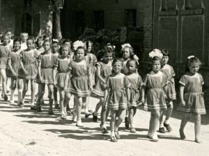 Kot lahko vidimo, so vse deklice oblečene enako. Najmlajše so nosile oblekice iz sivega platna, vrezane na gloken in malo nagubane, da ko so se zavrtele, so naredilo marelo. Na spodnjem delu krila so imele prišite tri vrste rdečih trakcev.