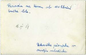 Parada na fotografiji je bila 16. 6. 1957 v središču Unca. Unška šola je takrat praznovala 100-letnico obstoja.