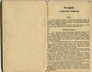 Prve delovne knjižice so ostale nespremenjene vse do leta 1922 in jih je moralo imeti vse zaposleno pomožno osebje. Za posle višje vrste niso bile potrebne. Izdajale so jih občine stalnega bivališča delavcev, ki so morale voditi register izdanih delovnih knjižic. Obliko je predpisal minister za socialno politiko v sodelovanju z ministrom za notranje zadeve. Mlajši od 16 let so jih lahko dobili le s soglasjem očeta ali varuha, brez nje pa zaposlitev ni bila mogoča. Vanje so vpisovali trajanje delovnega razmerja in podpore za brezposelne, ni pa bilo dovoljeno vpisovati ničesar, kar bi delavcu škodilo. Bile so namenjene tudi uveljavljanju popustov za prevozne stroške pri iskanju zaposlitve, oskrbi v delavskih domovih in uveljavljanju drugih ugodnosti in pravic pri javnih borzah dela po vsej Jugoslaviji.