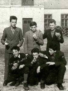 Nižja gimnazija Postojna, ki smo jo obiskovali iz našega področja, dokler ni zaživela na Rakeku osemletka. Malica ob glavnem odmoru. Ne vem, pred čigav objektiv smo se postavili na dvorišču za šolo, ki je bila takrat na Ljubljanski cesti, kjer je danes Ljudska univerza v Postojni.