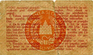 Zadnja stran: V sredini je okrogel emblem v oranžni barvi s Triglavom v sredini, ki ga obdajajo z obeh strani pšenični klasi, po obodu pa poteka napis: Osvobodilna fronta slovenskega naroda. Ostala ploskev obveznice je izpolnjena z risanim rastrom iz oranžnih črk OF, čez vse pa je natisnjeno v dveh stolpcih besedilo v temno rdeči barvi: