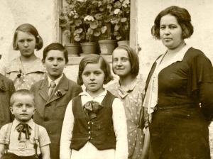 Čisto očarana sem nad lepoto moje tete Mice, ki stoji tam zadaj v beli bluzici in telovniku, ki ji ga je kot moji mami najbrž sešila starejša sestra Reza. Izza ovratnička kuka pentlja.