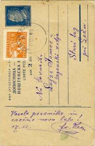 Je nekdo Koča vas naslikal na dopisnico? Čisto mogoče in sploh ni slaba domislica. Pa kako se je moral potruditi! Prav rada bi ga poznala. 17. 12. 1951 je nekdo z zavidanja vredno čitljivo pisavo poslal voščilnico trgovcu Lojzetu Tomcu v Stari trg.Slovarček: