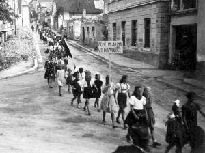 “Žene, mladina Vsi na volišče!” je zapisano na transparentu, ki ga nosi mladinka na povorki v Cerknici avgusta 1945.