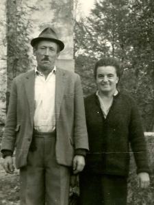 Jerčinova Anton in Francka Janež se zadovoljna vračata domov. Naredila sta dobro delo. Morda sta očistila cerkev, ali pa uredila njihov družinski grob? Kdo ve? Fotograf ju je ujel v objektiv pred cerkvijo sv. Frančiška Ksaverja. Takrat še ni bilo vrat na ograji in asfalta tudi ne. Ne vem, ali je deževalo, ali se pripravlja k dežju, ker ima Francka dežnik. Prav na iniciativo Jerčina se je okrog leta 1970 prvič po vojni prebelila cerkev. Stroške je plačala nadškofija.