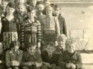 Kar dva učenca držita v roki knjigo, na kateri je velik naslov: GAVROCHE. Ne vemo, kako je knjiga prišla v roke učencev. Lahko, da je bila učbenik, lahko pa sta jo dobila kot priznanje za odličen uspeh. V bibliografiji pisca učbenikov Frančka Šafarja je omenjena knjiga: V. Hugo, Gavroche (odlomki iz Nesrečnikov) 1949;Viri: