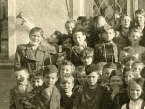 Zadaj za učenci so lepa vhodna vrata in okno z železnimi žaluzijami. V tej stavbi je poleg sodišča tiste čase delovala redna ambulanta z dr. Pušenjakom in medicinsko sestro Tilko Keržič, poročeno Bombač.