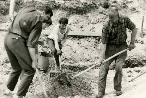 Vsaj štirje ljudje so bili potrebni pri ročnem mešanju betona: na kup peska se je stresla potrebna količino cementa, potem pa sva dva (jaz in oče) najprej na suho dvakrat z lopatama premetavala pesek in cement, brat Boris pa je to z grabljami mešal, da sta bila pesek in cement med seboj dobro premešana. Potem je sledilo polivanje z vodo; za menoj v ozadju z ajmarjem vode je soproga Marija.