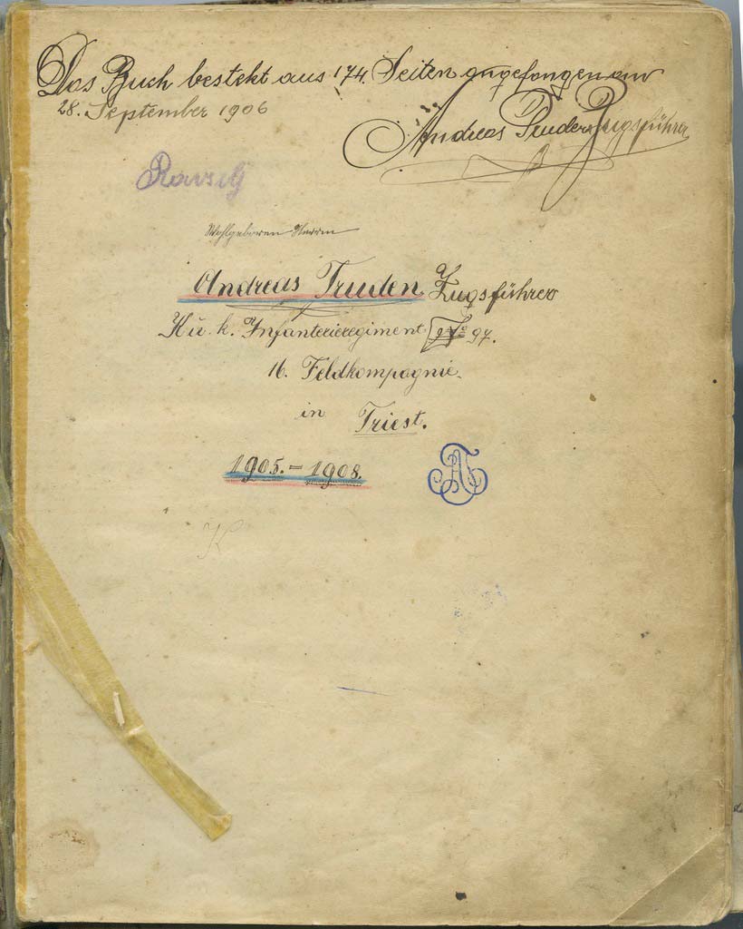 K.u.K. Infanterieregiment ?? 297., pod tem pa: 16. Feldkompanie in Triest 1905 – 1908. In prvič še monogram v modrem: A T … Nemščine ne znam in vojaške zgodovine ne poznam, zato ta zapis le nemočno prepuščam bolj podkovanim in upam, da bo kdo od njih povedal nam vsem več, kot lahko jaz le ugibam.