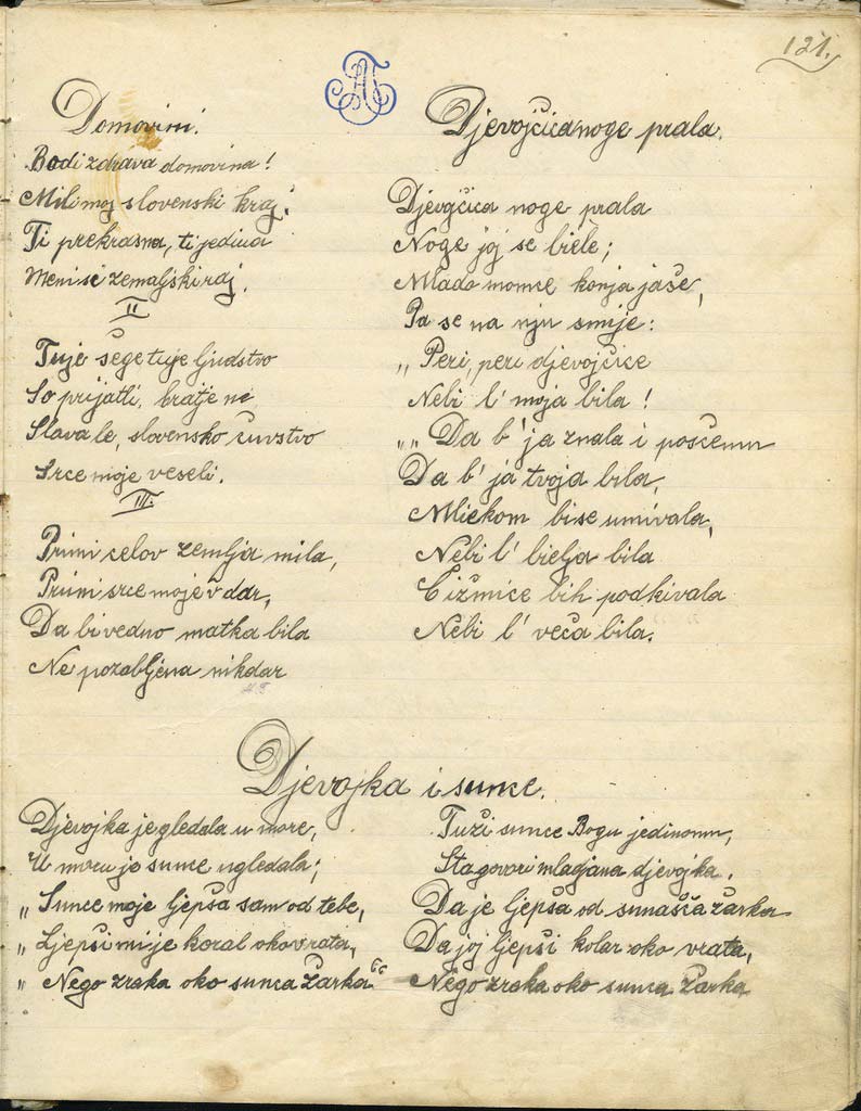 Pod monogramom cugsfirerja Andreja Trudna je na strani 121 prva napisana (Ipavčeva?) Domovina, ki se še vedno poje, takoj za njo pa dve hrvaški: Djevojčica noge prala in Djevojka i sunce. Pisava je tu še lepopisna, Trudnova, enaka kot v vojaških zapiskih, zadnji del zvezka pa je popisan z drugačno pisavo, manj “nedeljsko” ali celo povsem tujo – za zanesljivo ugotavljanje bi že morala biti grafološko podkovana, kar pa seveda nisem.Slovarček: