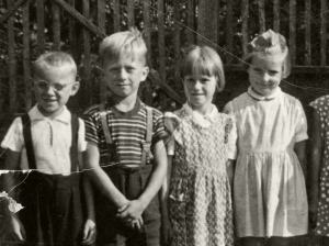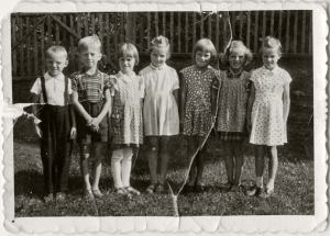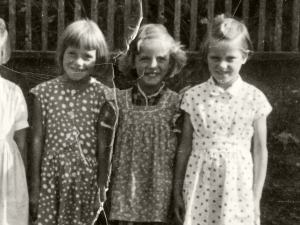 Na fotografiji smo Zvonka Purkart, Fani Anzeljc in Angelca Doles. Ob gledanju te fotografije se sprašujem, zakaj smo se v tako nežnem, zgodnjem otroštvu med seboj klicali s tako odraslimi, prav grdimi in skoraj zmerljivimi imeni kot: Zvona, Fana, Angela … Ja, tako so nas klicali tudi starši, kot da nas ne bi marali, kot da smo jim bili nebodigatreba. Pa tako ljubke in radožive deklice smo bile.