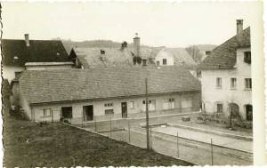 V celoti pa se spredaj vidi nizka zgradba, kjer je v času nastanka slike še delovala pekarija. Najstarejši moj spomin nanjo seže v petdeseta leta, ko je tam delal pekovski mojster Martinek z družino. Njegovo ime sem pozabila, a čisto mogoče je bil sin Stane, moj sošolec, poimenovan po njem. Mogoče pa je bil mojster Jože ali Pepe … Na to misel me vodi spomin na igro, ki smo se jo pogosto šli na poti domov: treba je bilo sestaviti čim daljši stavek, v katerem so se vse besede začele na določeno črko. Na primer: Pekov Pepe peče preste po petindvajset par … Ali: Kovačev Korl krepko kuje Kolajevega kumrnega konja … Okoli pekarije smo na poti iz šole zelo radi postavali, ker je iz nje vedno tako lepo dišalo in včasih smo si tudi kupili rezino rahlega belega ali črnega pekovskega kruha, ki je bil po besedah starcev “kot sapa” – nič ni zalegel, saj je samo pihnil skozi čreva. A bil je takooo dober … Takrat je še bilo mogoče kupiti le rezino in nič več … Tisto sem pa nekje že povedala, kako sem z obgrizeno in poščipano belo štruco v vrvnati mreži srečala pisatelja in – ravno takrat tudi ministra – Matevža Haceta, ki mi je naredil pridigo o spoštljivem ravnanju s kruhom.