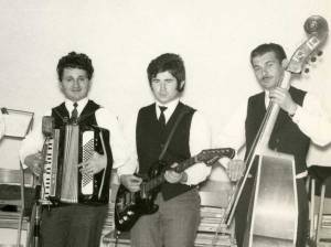 Ja, prva dva z leve sta France Žnidaršič – Žfran, ki je več kot 50 let deloval v Pihalnem orkestru oziroma godbi že tam nekje od leta 1954 naprej, vmes pa igral tudi v raznih ansamblih kot je ta na sliki, pisal besedila za narodno zabavne viže, a tudi prevzel vlogo kapelnika, ko je godbi že grozil razpad. Pa še kaj narisal je mimogrede. Drugi je Jože Žnidaršič, ki s prvim ni v sorodu, sta pa dolga leta skupaj muzicirala pri godbi in tudi tukaj. Tretji je harmonikar Jože Truden, že pokojni, ki je s svojo harmoniko razveseljeval družbe daleč naokoli tako rekoč do zadnjega diha. Poleg njega z električno kitaro stoji Ljubo Bavec – Lubče, verjetno v času s slike še vedno tudi član skupine Deltoidi, drugače pa daljni sorodnik fotografa Vinka Bavca, o katerem smo na Starih sikah tudi že kakšno rekli. Zadnji je Bogomir Mulec, Culcov Bogo iz Pudoba, ki je v prostem času brenkal na bas pri tej skupini z imenom Notranjci, drugače pa delal v Kovinoplastiki, kot tudi ostali štirje kolegi s slike.