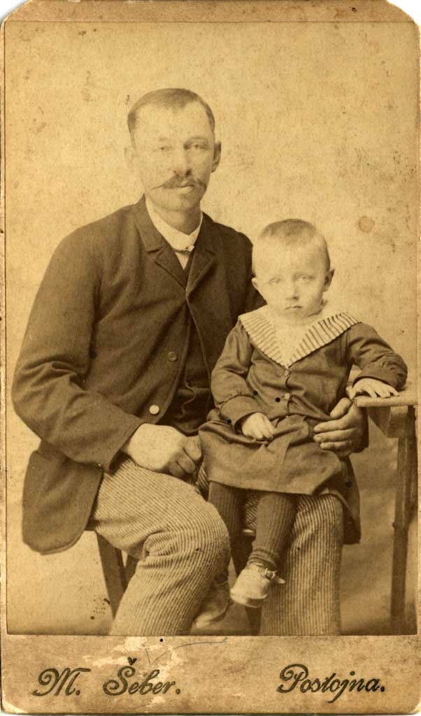 Na sliki je Andrej ml. s sinčkom Viktorjem na kolenu. Andrej ml. je bil dvojček mojega pradeda Maksa Lavrenčiča. Fotografijo je posnel Maks Šeber ml. v svojem ateljeju v Postojni. Letnica nastanka fotografije 1890 je zgolj ocenjena glede na znane podatke. Andrej ml. ima na sliki okrog trideset let, sin Viktor pa je še majhen otrok.