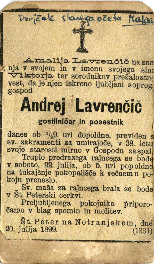 Iz časopisa izrezana osmrtnica, nalepljena na hrbtni strani fotografije, sporoča, kako mlad je moral umreti Andrej. Ni dopolnil niti osemintrideset let. Zapustil je ženo Amalijo in sina Viktorja.
