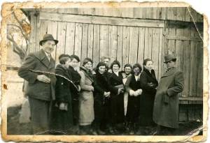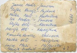 Dekleta imajo enotna pokrivala – temne baretke, ki so potisnjene postrani, da se vidijo urejene frizure. Okoli vratu imajo skoraj vse kožuščke, Tonova Iva celo lisičjega. Vsa dekleta so v lepih dolgih plaščih, v rokah imajo torbice. Moj oče – skrajno desni, si je kot krojač izdelal že kar gosposki plašč in ima na glavi moderen klobuk, kaj drži v levi roki pa nisem ugotovil.