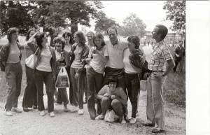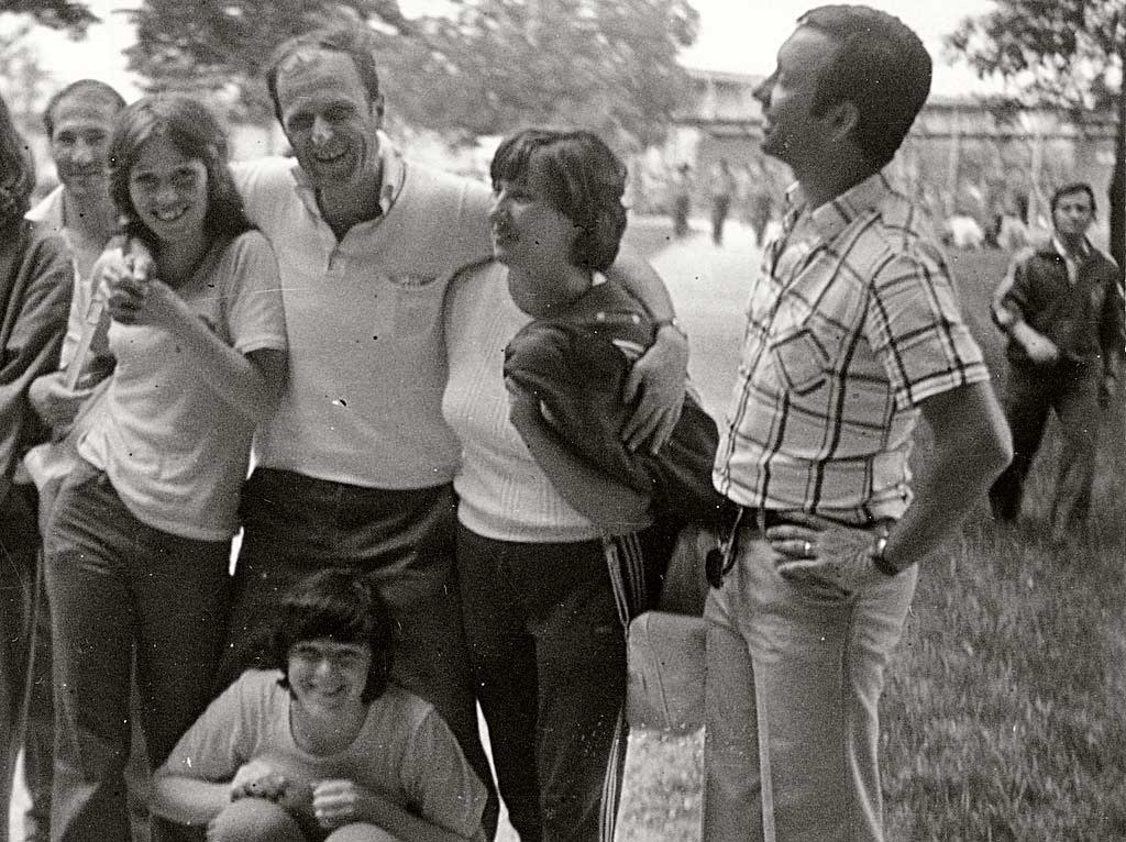 Prva na levi je Danica Modic, za njo Romana Janežič, pred njo Magda Mesojedec, sledi Marica Muha, za njo Magda Skuk, nato Lidija Štrukelj, moški za njo je navdušeni navijač Ivan Najger, pred njim v objemu s še bolj navdušenim navijačem Janezom Lavrenčičem sta Zvonka Ješelnik in Iva Zigmund in na koncu ponosni član moške odbojkarske ekipe Ljubo Ule. V čepečem položaju pred Lavrenčičem je Anica Čenčur, kapetanke Brestove odbojkarske ekipe, Erne Žunič pa žal na fotografiji ni.