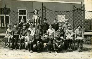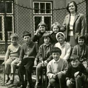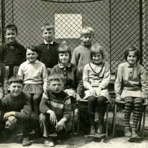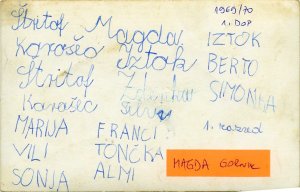 Begunje, šolsko leto 1969/70, 1. razred dopoldne. Zaradi velikega števila otrok so v osnovni šoli Begunje organizirali pouk v 1. razredu v dveh skupinah. Ena je hodila v šolo dopoldne, druga popoldne. Tako je trajalo vse do 4. razreda. Dopoldne so šolo obiskovali učenci iz bolj oddaljenih krajev. Organiziran so imeli avtobusni prevoz. Danes imamo pred seboj sliko osemnajstih dopoldanskih prvarčkov in njihove razredničarke Karoline Strle. Med njimi sta sestri dvojčici Sonja in Marija Petrič.