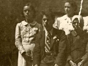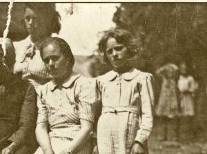 Sedi hčerka Marija (Mima), poročena Kateren, poleg nje stoji Francka, poročena Ankele in zadaj Antonija, poročena najprej Kovačič in nato Purkart.Slovarček: